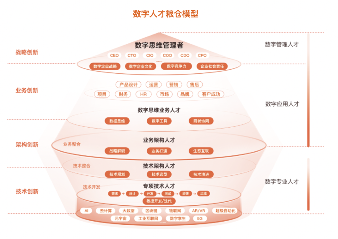 数字人才粮仓模型就是把企业做数字化转型必须要做的事情作为出发点,对应到需要什么样的人才、需要哪些岗位能力的变化。