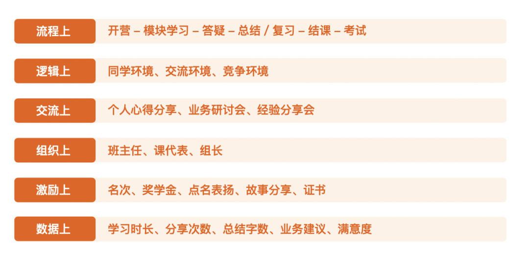 ● 流程上:开营-模块学习-答疑-总结/复习-结课-考试